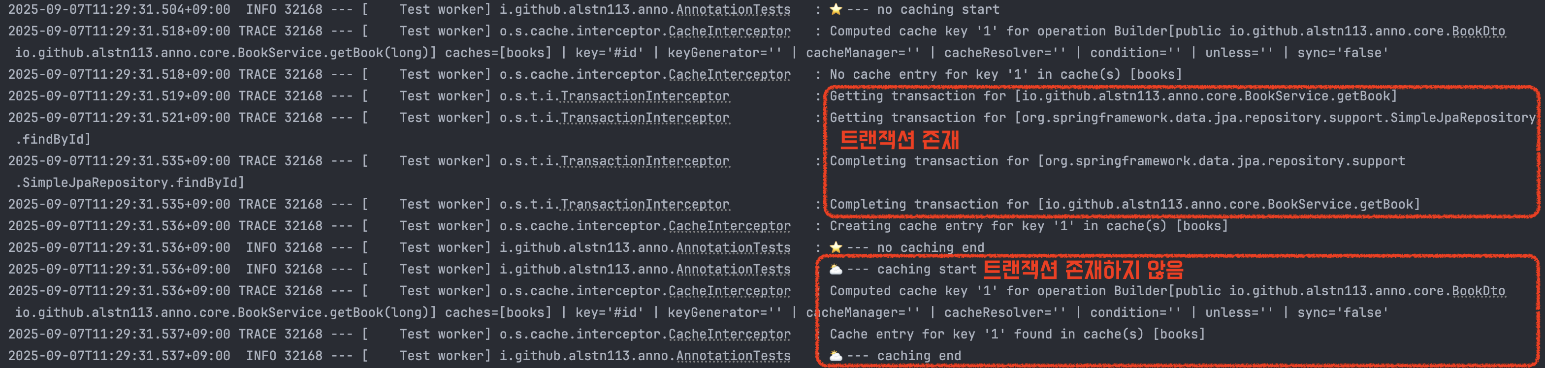 AnnotationTests 실행 결과를 확인하면 첫 번째 getBook 메서드 실행 시에는 트랜잭션이 존재하고, 두 번째 getBook 메서드 실행 시에는 트랜잭션 없이 캐시된 데이터를 반환하는 것을 알 수 있다. 또한, 첫 번째 메서드에서 트랜잭션을 시작하기 전에 캐시를 먼저 확인하는 것을 알 수 있다.